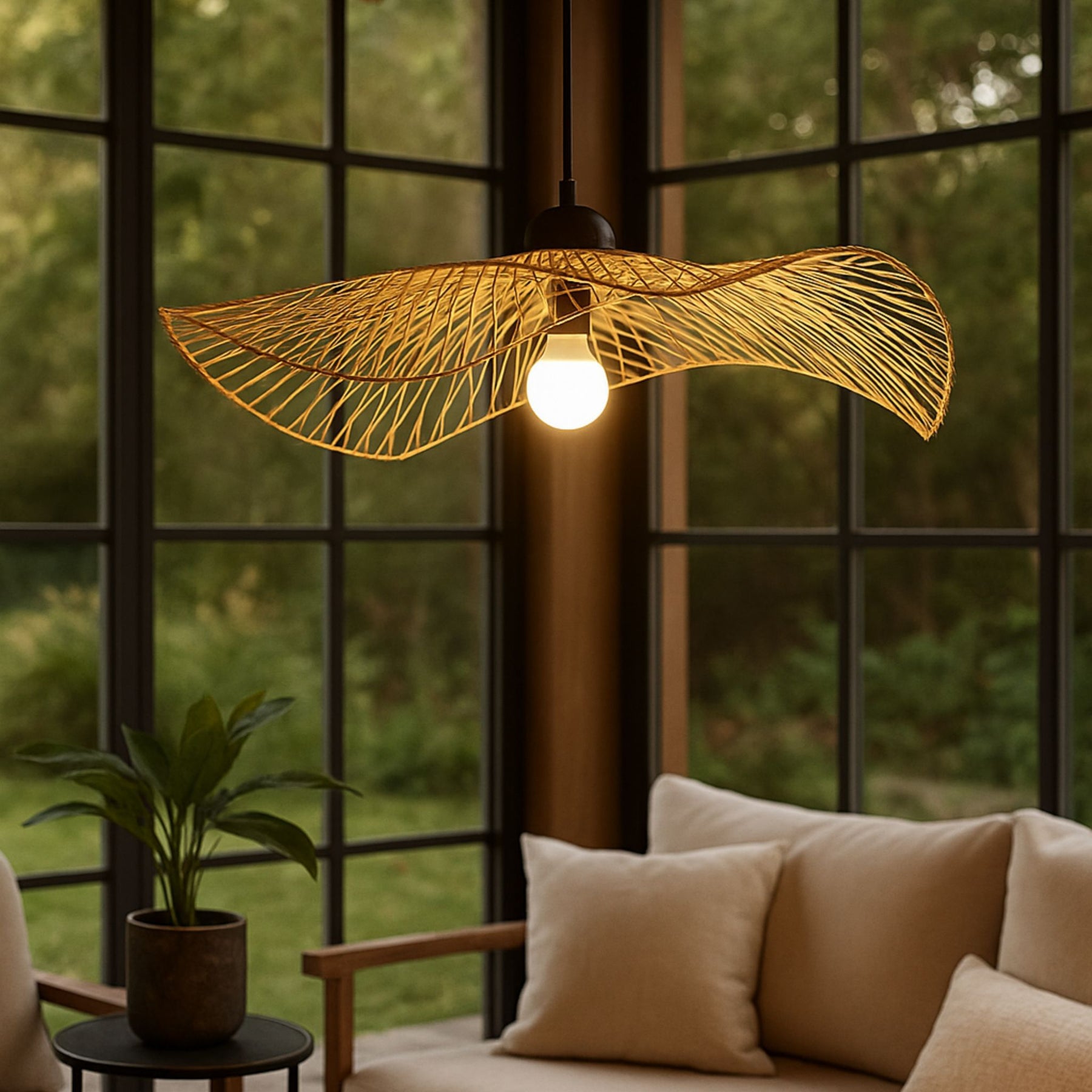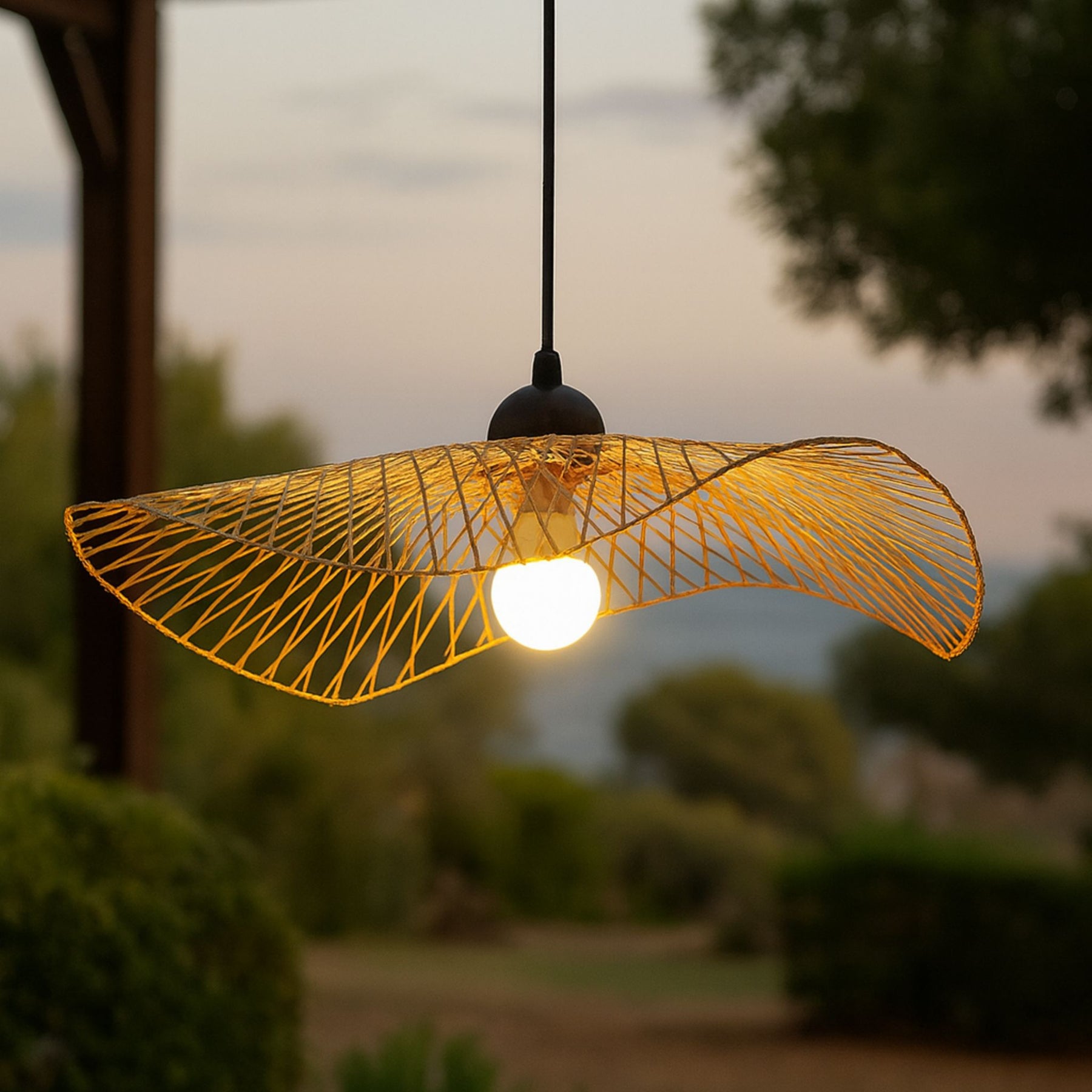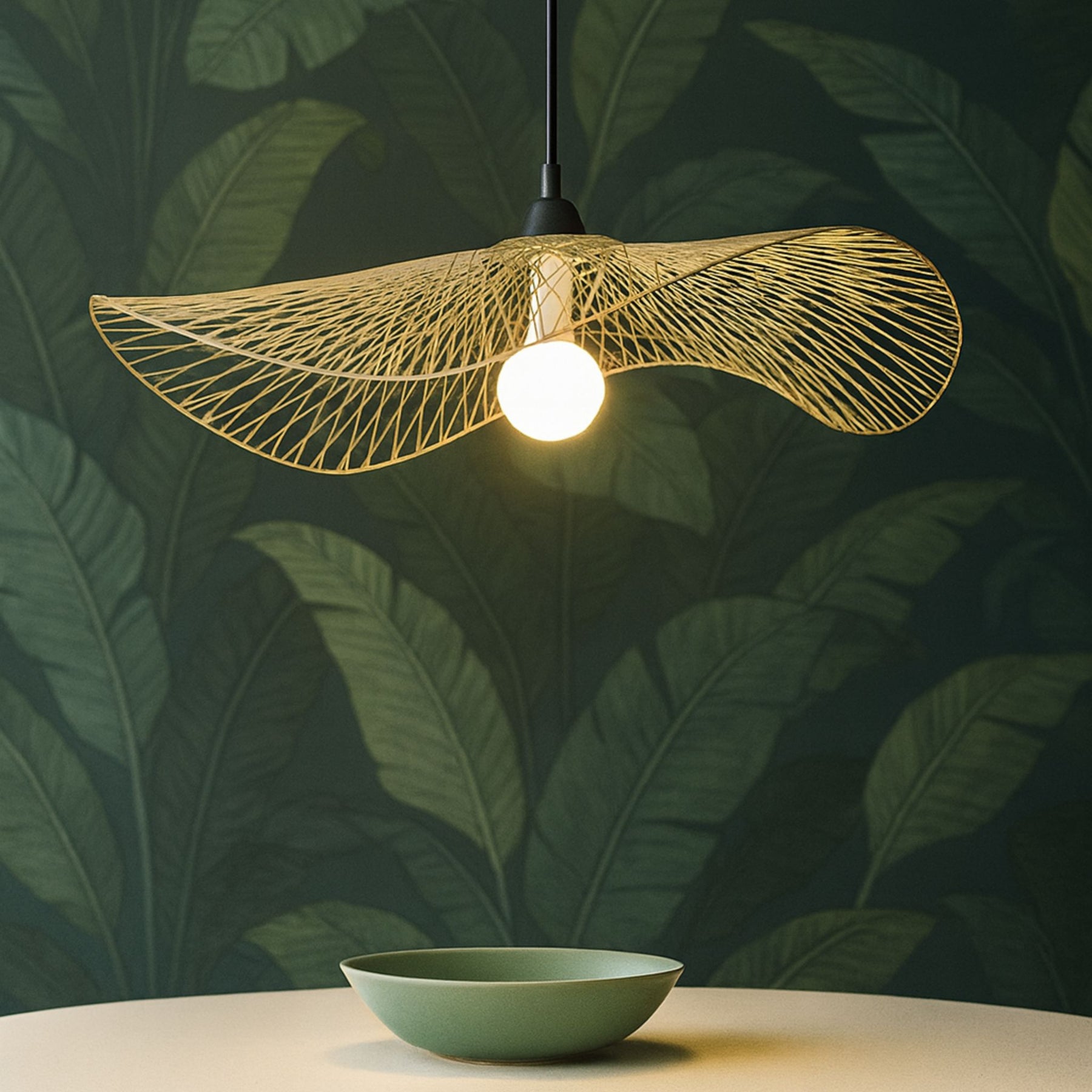 Denna taklampa kombinerar traditionellt hantverk med modern design och skapar en stilfull belysning som både passar moderna och klassiska interiörer. Den handflätade skärmen har en luftig och organisk form som låter ljuset spridas på ett mjukt och naturligt sätt, samtidigt som den unika konstruktionen ger ett levande skuggspel ir