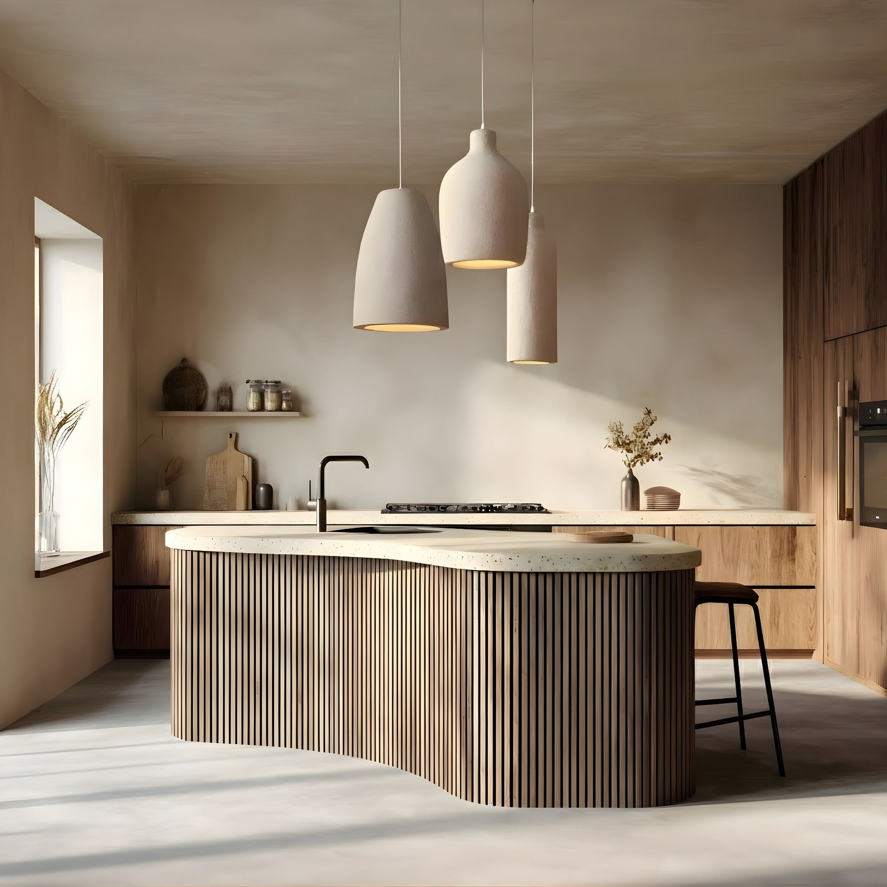 Taklampa Cirrus placerade över köksö i ett modernt skandinaviskt kök med naturmaterial och mjuk belysning.
