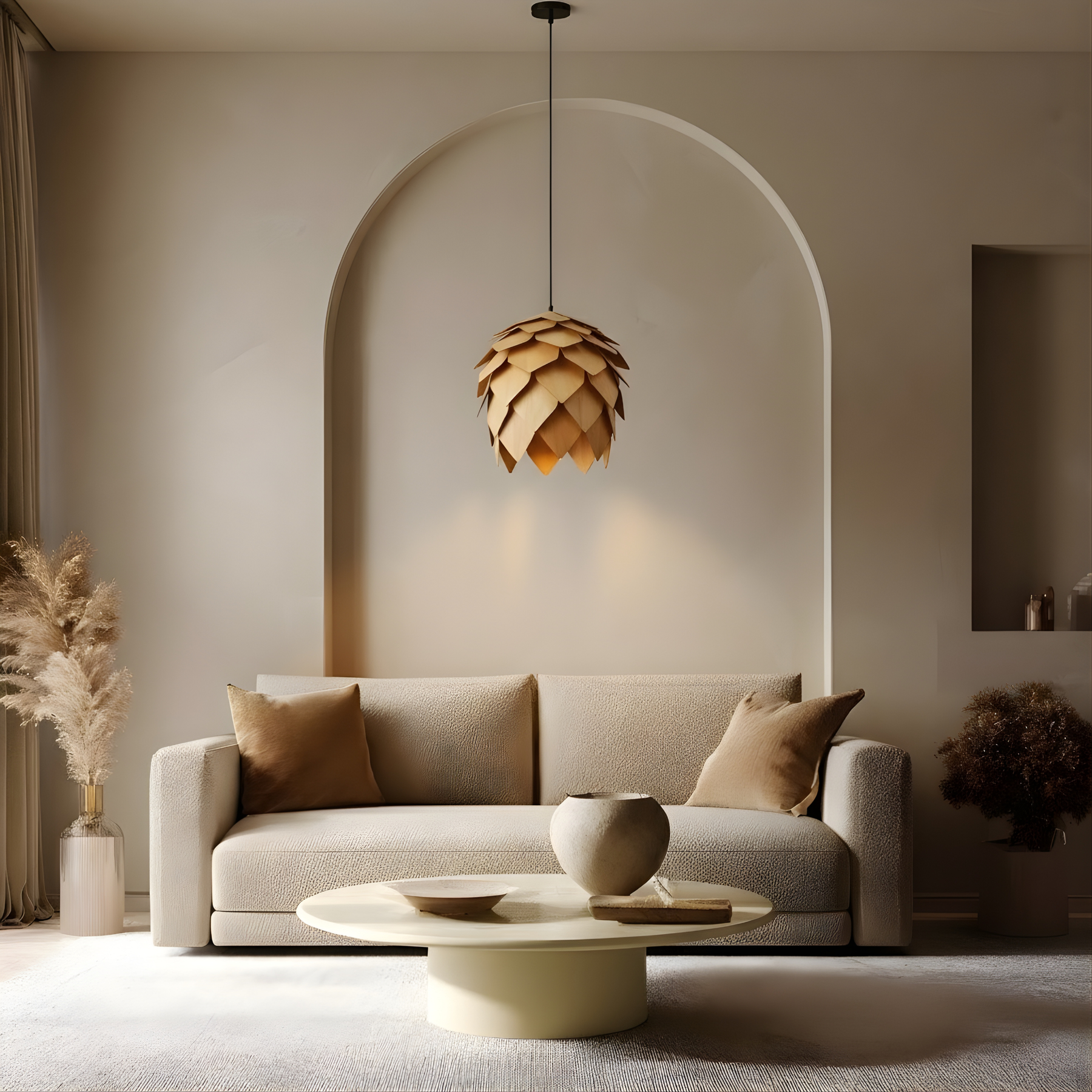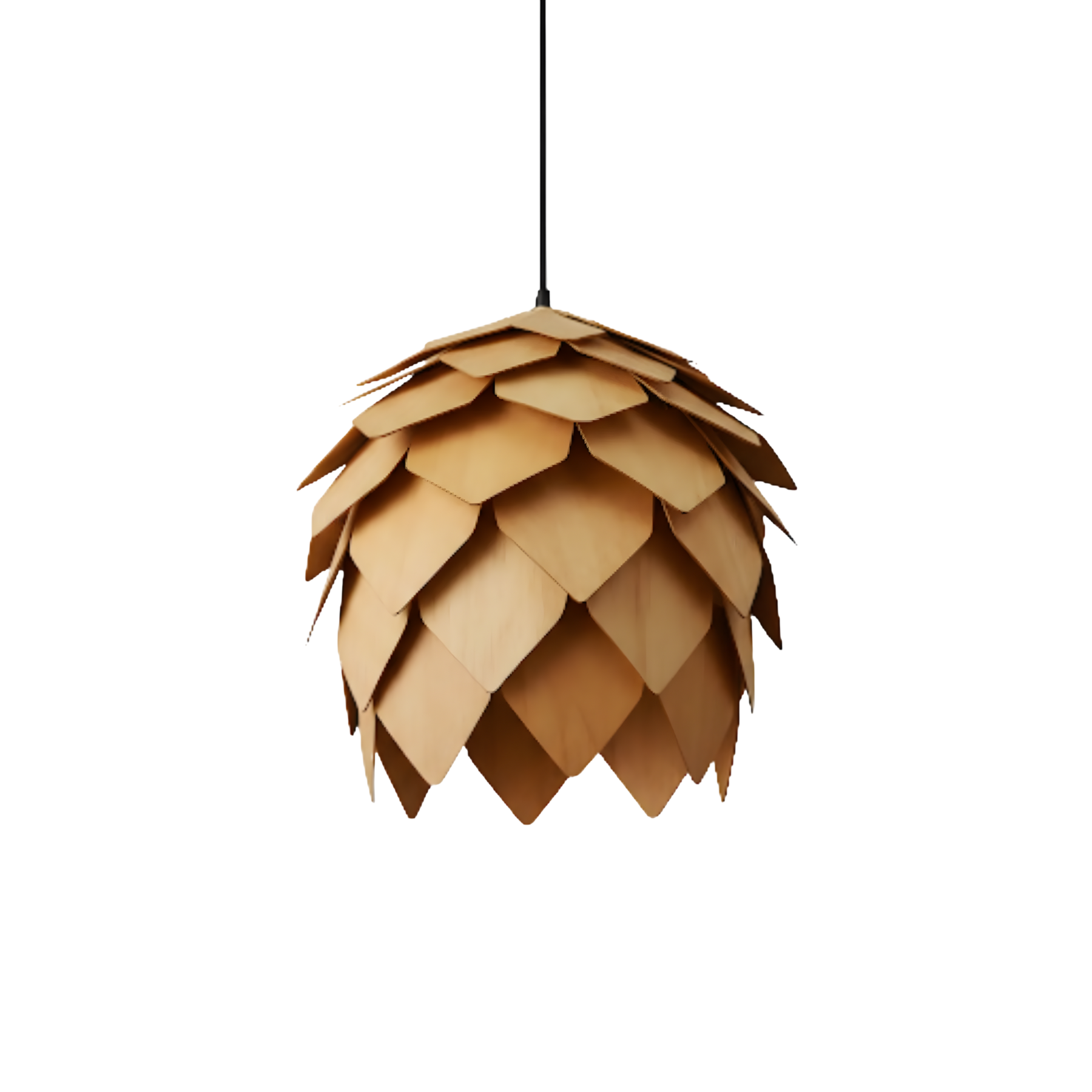 Kotte är en taklampa som hämtar sin inspiration från skogens stillhet. Med sina lager av bladformade skärmar liknar den en kotte eller blomknopp, och skapar ett varmt, mjukt ljusspel som sprider sig vackert över väggar och tak.