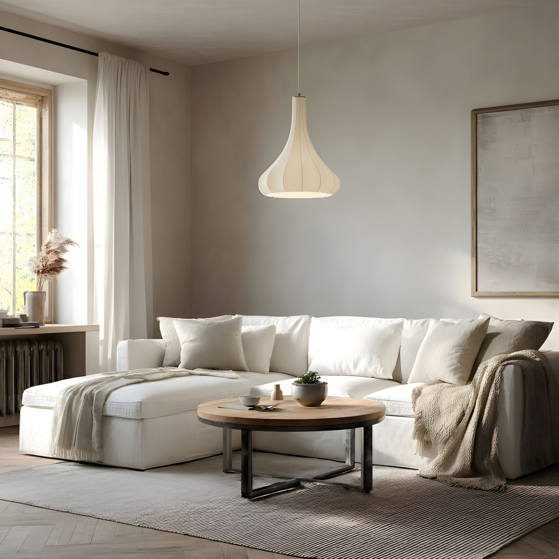 Denna taklampa kombinerar en tidlös form med en stilren design för att skapa en vacker och funktionell ljuskälla. Den droppformade skärmen med mjukt veckade linjer ger ett harmoniskt uttryck och sprider ljuset på ett behagligt sätt. Perfekt att placera över matbordet, i vardagsrummet eller som en dekorativ detalj i sovrummet.