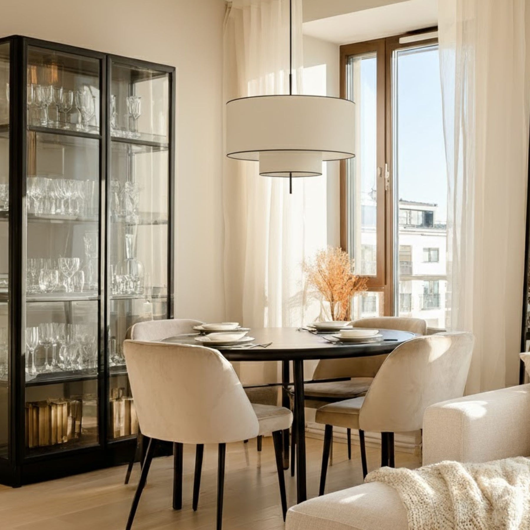 Med sin rena siluett, svarta upphängning och dubbla skärmstruktur får lampan ett subtilt djup och en stilren karaktär som fungerar i alla typer av inredningar – från skandinavisk minimalism till hotellkänsla.