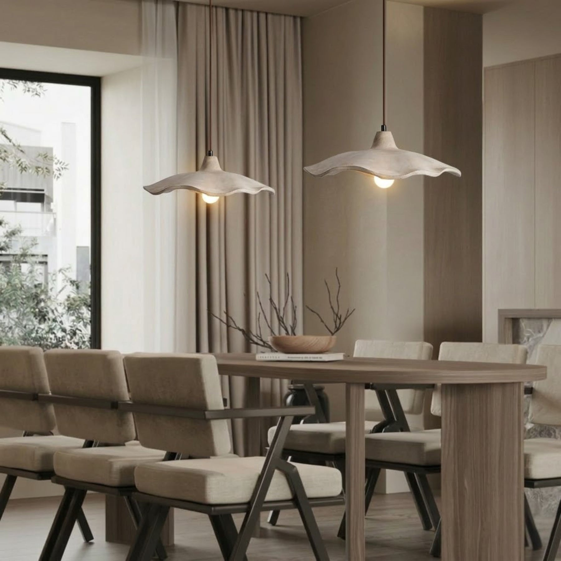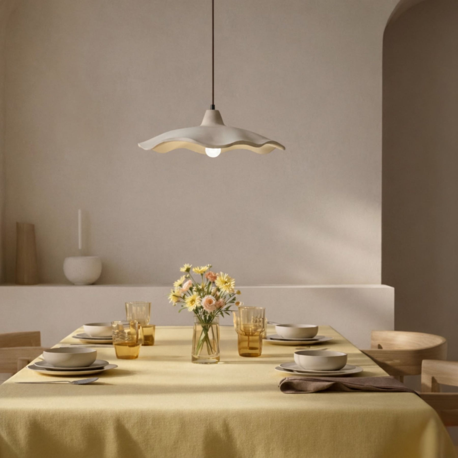 Denna taklampa kombinerar en skulptural design med mjuka, organiska linjer för att skapa en unik och stilren ljuskälla. Den vågformade skärmen ger lampan ett dynamiskt uttryck och sprider ljuset jämnt i rummet. Oavsett om den placeras över matbordet, i vardagsrummet eller som en dekorativ detalj i köket blir den en naturlig del av inredningen.