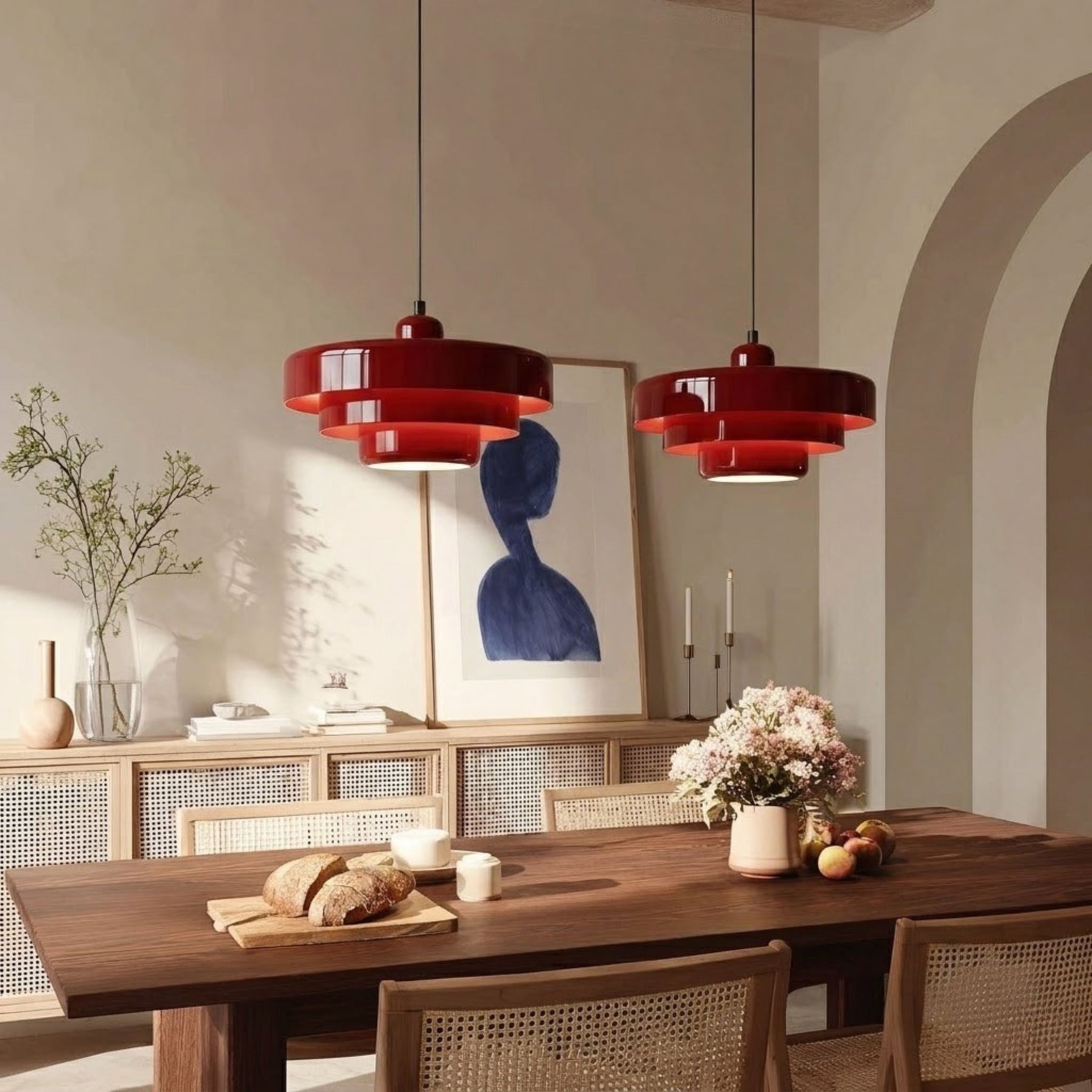 Pendellampa Italia i röd har en form inspirerad av Bauhaus där funktion och enkel geometri står i fokus. Den kupade metallskärmen ger lampan ett tydligt uttryck och riktar ljuset nedåt, vilket gör den särskilt användbar över matbord, köksö eller andra ytor där du vill samla ljuset.