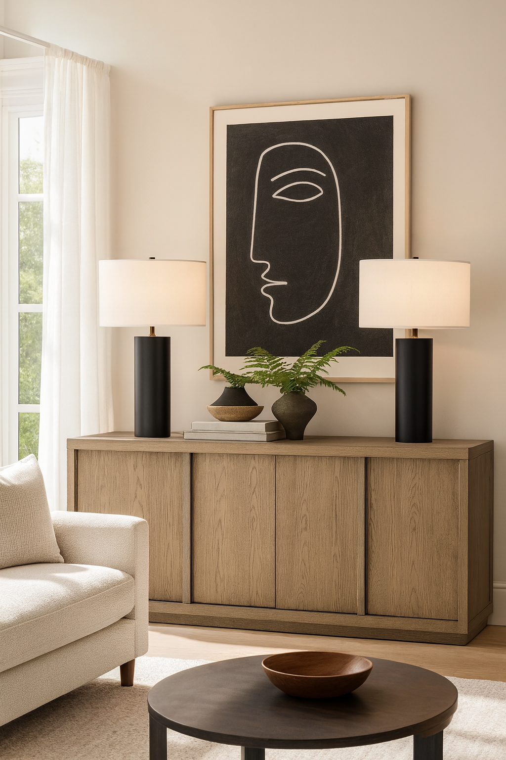 Bordslampa Atlas är en stilren och tidlös bordslampa som kombinerar modern minimalism med skandinavisk elegans. Den cylindriska foten i mattsvart metall ger ett kraftfullt uttryck, medan den runda textilskärmen i varmvit ton sprider ett mjukt och behagligt ljus.