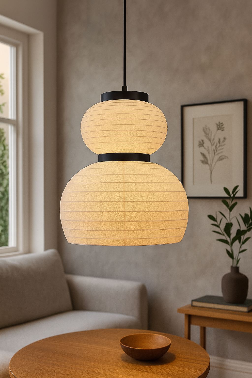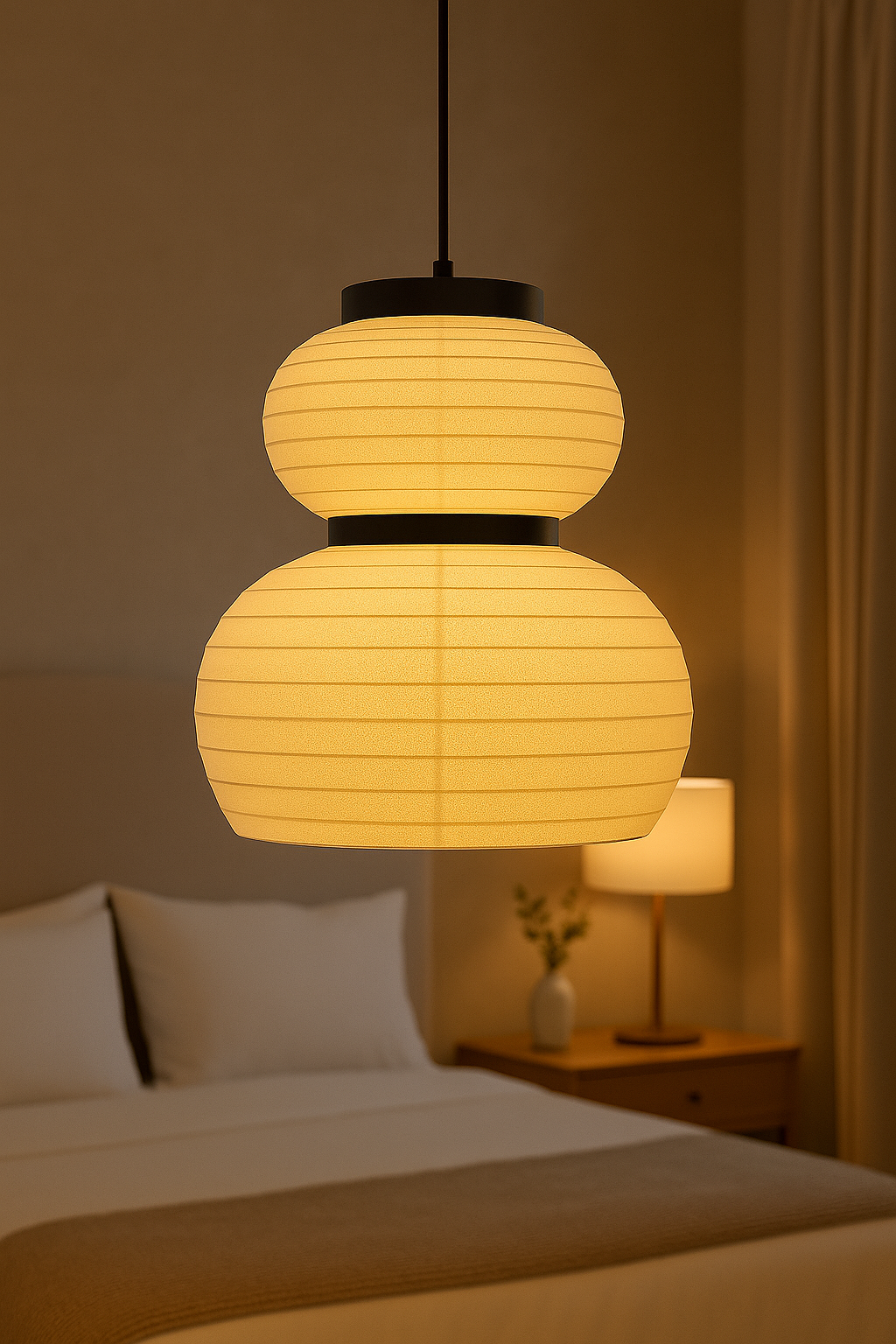 Den dubbla skärmen formar en elegant siluett som för tankarna till japansk minimalism. Den övre globen balanserar smidigt ovanpå den bredare, nedre kupan och ger ett vackert ljusspel när lampan är tänd.